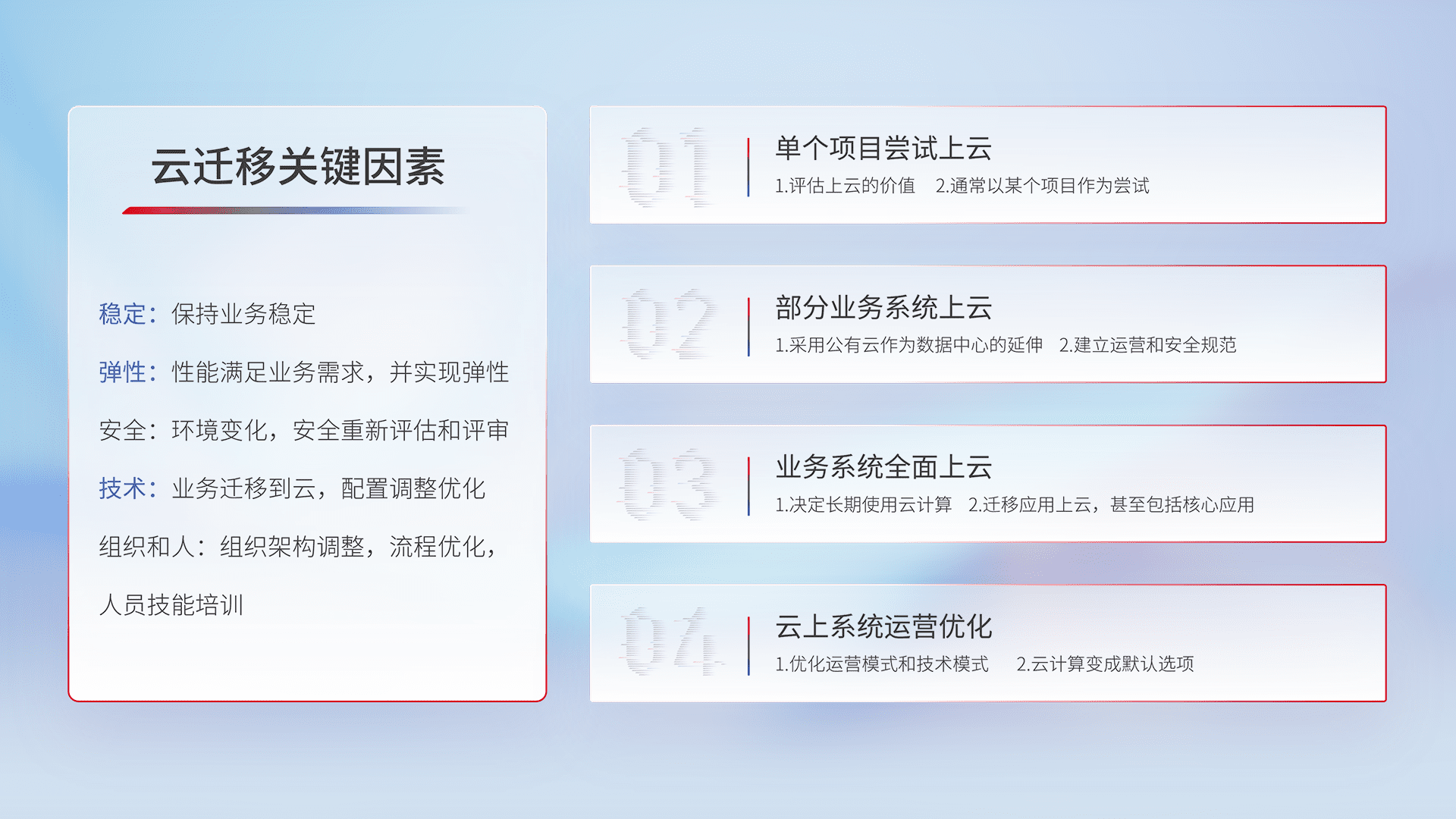 结合实际业务,,从规划设计、、云平台选型、、、、云原生改造、、数据迁移、、、集成交付,,,迁移全过程为客户识别最佳上云路径,,,做好风险识别管理,,,,设计网络架构、、、身份权限、、安全审计合规、、操作审计、、、、日志审计、、、监控告警策略、、多站点容灾设计等,,,,对云上基础设施进行整体规划,,提升IT治理水平,,,以满足弹性、、高可用、、、高性能的需求。。。