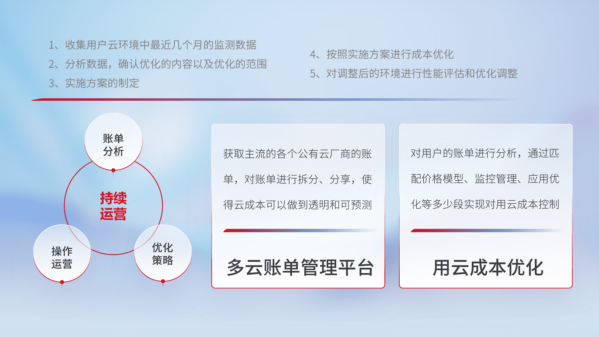 通过多云纳管,,,,以统一的资源数据模型把客户的云资源进行抽象和封装,,进而实现对多云资源的统一操作,,保障云资源管理的可靠性、、、、稳定性与可用性。。量身定制化运维内容,,,配置、、开发运维、、、、补丁管理、、备份、、、监控、、、认证和访问管理、、、审计和日常巡检等,,,保障在用云过程中的可靠度,,稳定度以及高可用率。。。。